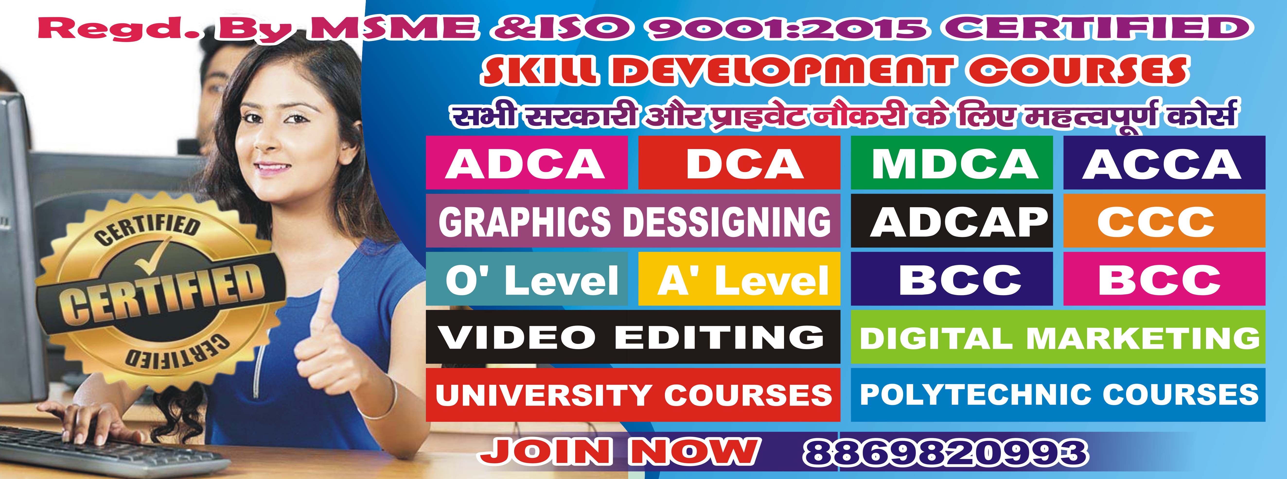 Global Training Institute of Skill Development & Global Computer Institute “Divya Singh Education Society Sirsaganj, Firozabad” Delhi An ISO 9001:2015 Certified has been registered under the society Act. 21, 1860. (Reg. No. 6361/Ag57357/2012-13) & MSME Govt. of India . Working in different fields of Education Information technology, Vocational Education, etc. The our aim. Since 10 Years success, conducting various commercial training programs, our Organization decided to work in "Vocational Education & Industrial Training for all" up to 2016 to 2017 given the slogan by the Indian Govt. For formulating the dream of Indian Govt. fulfill the requirement of employment of 5 lac in I.T. Technology and more than other 10 Lac ancillary requirement of computer operator / specialist in industrial development, small scale industries, Our Organization make an important role in the mission GTISD,GCI.